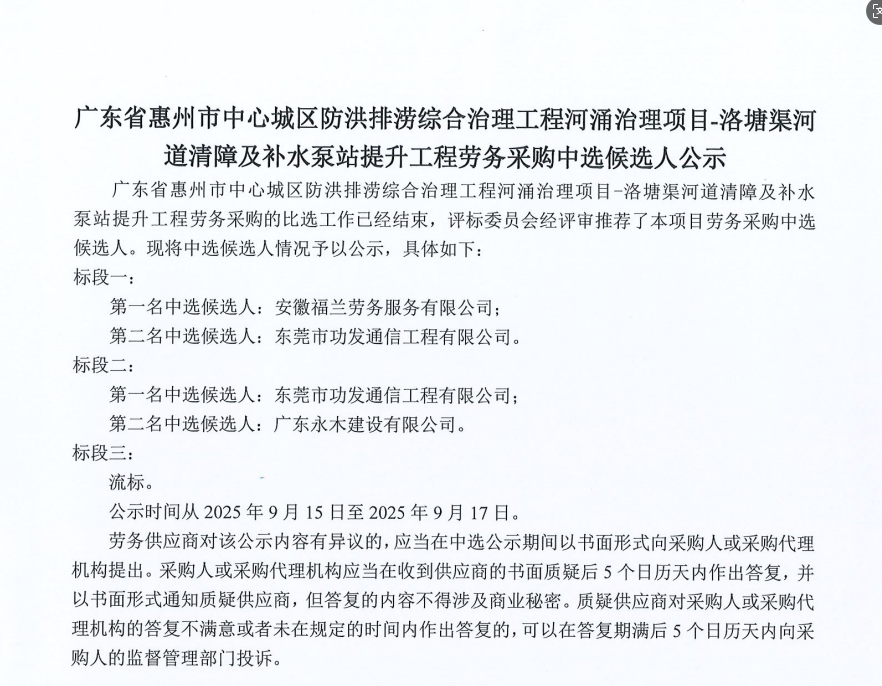 惠州市增江龍門段治理工程施工(一標(biāo)段)勞務(wù)采購中選候選人公示……